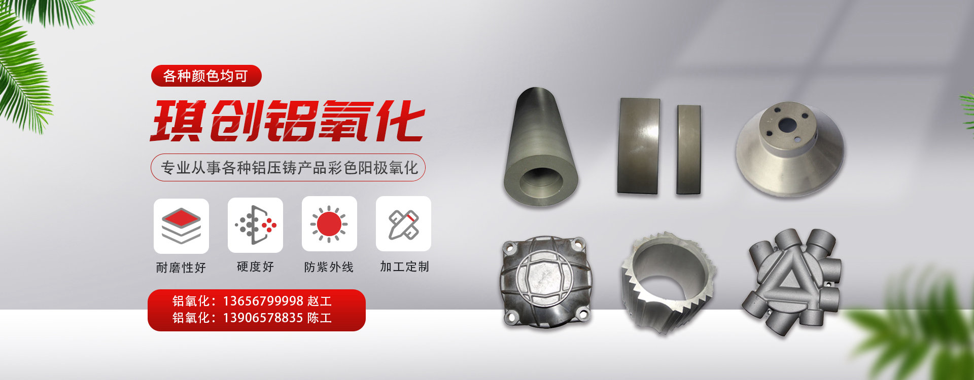 專業(yè)從事各種鋁壓鑄產(chǎn)品彩色陽極氧化(各種顏色均可)。以及鋁制品表面處理,加工,項目有各型號鋁硬質(zhì)氧化,普通陽極氧化,電解著色、電解拋光,各種著色染色處理。本廠在壓鑄鋁,微弧氧化,低壓澆鑄鋁,重力澆鑄鋁鍛打鋁等硬質(zhì)氧化,普通陽極氧化工藝技術(shù)